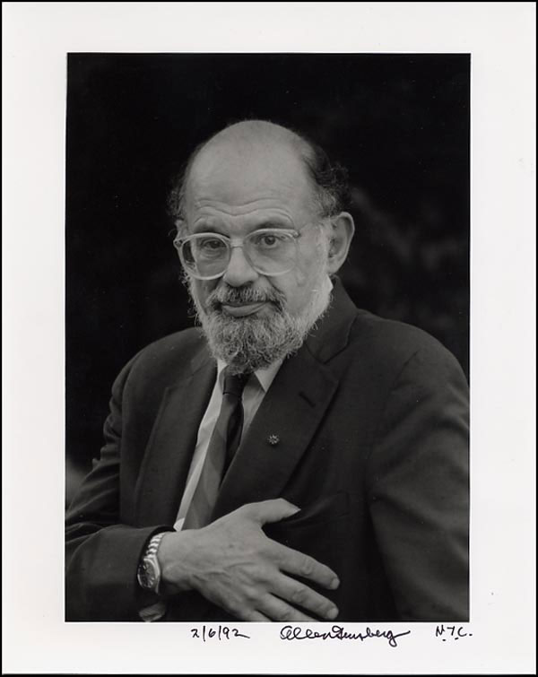 Glossy 8 x 10 portrait of the poet, signed in black felt tip in the wide border below the image. Ginsberg has added '2/6/92' and 'N.Y.C.' In fine condition. RRAuction COA.