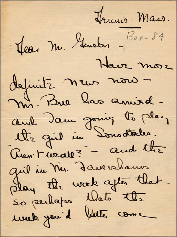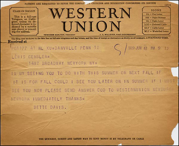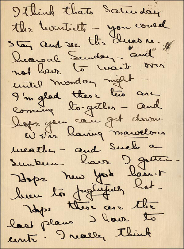 ALS, three pages on two adjoining sheets, 5.5 x 7, June 24, 1921. Davis writes to critic Gensler Lewis trying to coax him to her play. In part, 'I am going to play the girl in Sonsdales 'Aren't We All?'...so perhaps that's the week you'd better come...I think that's Saturday the twentieth. You could stay and see the dress rehearsal Sunday - and not have to wait until Monday night.' Accompanied by an earlier Western Union telegram from Davis to Gensler. In fine condition, with a light shade of toning. RRAuction COA.