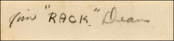 Vintage glossy 2.5 x 3.5 high school photo of James Dean in a jacket and tie, signed on the reverse in pencil, 'Jim 'Rack' Dean.' Nicely cloth matted and framed, so that signature is visible on the reverse, to an overall size of 9.5 x 11. In fine condition. RRAuction COA.