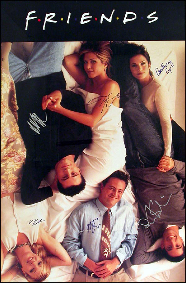 Color 23 x 35 poster, signed in blue felt tip and silver ink by all six cast members: Jennifer Anniston, Courtney Cox, Lisa Kudrow, Matt Perry, David Schwimmer and Matt LeBlanc. In fine condition. Rolled. RRAuction COA.