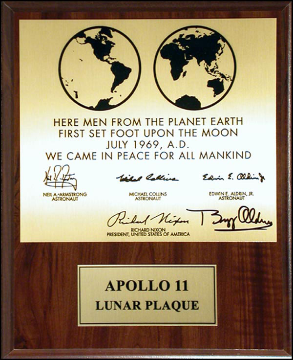 Replica of the plaque left on the moon by the Apollo 11 crew, 10.5 x 13, signed by Aldrin in black felt tip, under his facsimile signature. In fine condition. RRAuction COA.