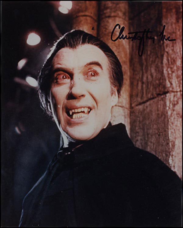 Eerie color glossy 8 x 10 photo of Lee as Dracula, signed in black felt tip. In fine condition. RRAuction COA.