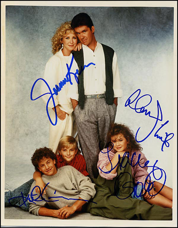 Color glossy 8 x 10 cast photo, signed in blue felt tip by four members: Alan Thicke, Joanna Kerns, Kirk Cameron and Tracey Gold. In fine condition. RRAuction COA.