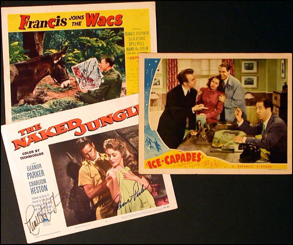 Lot of three original signed color 14 x 11 lobby cards. The Naked Jungle, signed in felt tip by Charlton Heston and Eleanor Parker, Francis Joins The Wacs, signed in felt tip by Donald O'Connor and Ice Capades, signed in blue ink by Phil Silvers. In fine condition, with some scattered light soiling and a small tear to left edge of Jungle card. RRAuction COA.
