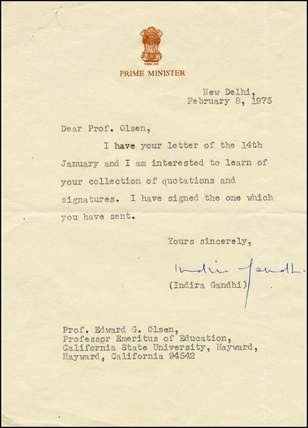 Daughter of Jawaharlal Nehru and later prime minister of India herself, she was assassinated in 1984 by Sikh extremists because of her opposition to the establishment of an autonomous Sikh state. TLS, one page, 6 x 8, Prime Minister letterhead, February 8, 1975. Short letter to a collector. In part, 'I am interested to learn of your collection of quotations and signatures. I have signed the one which you have sent.' In fine condition, with staple holes to top left corner. RRAuction COA.
