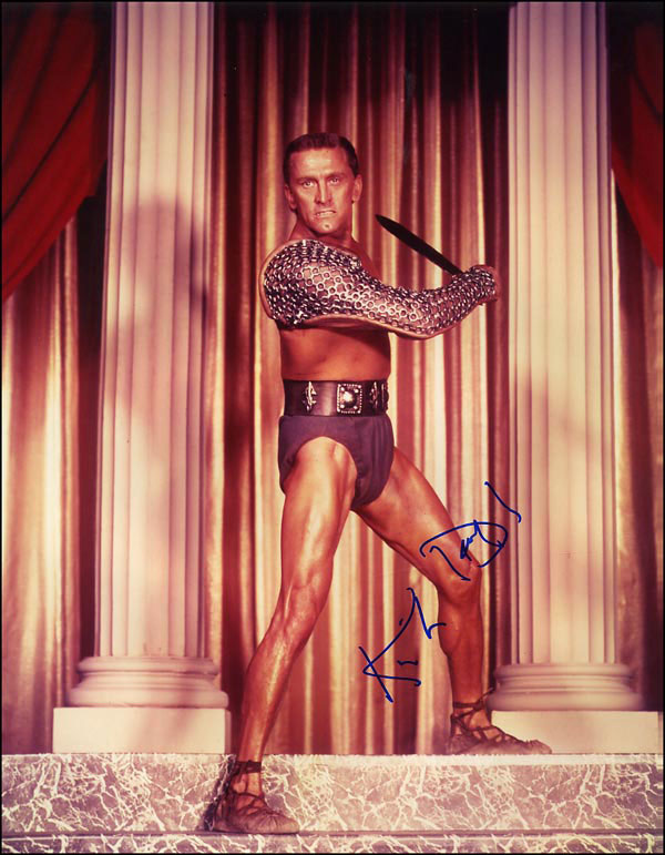 Excellent color glossy 11 x 14 photo of Douglas as Spartacus, signed in blue felt tip. In fine condition. RRAuction COA.