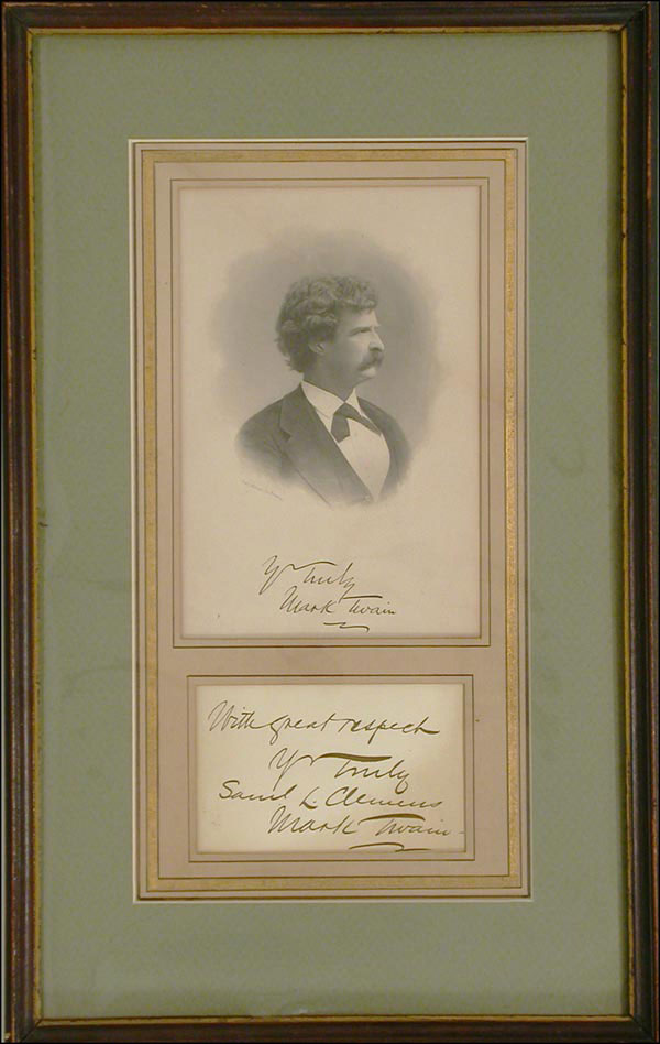Fountain pen signature, 'With great respect, Yrs truly, Saml. L. Clemens, Mark Twain,' on an off-white 4.5 x 3 card. Double matted and framed with a steel engraved portrait of Clemens, bearing a facsimile signature, to an overall size of 11 x 17.25. In fine condition, with a few area of light toning, not detracting from bold signature and sentiment. COA John Reznikoff/PSA/DNA and RRAuction COA.
