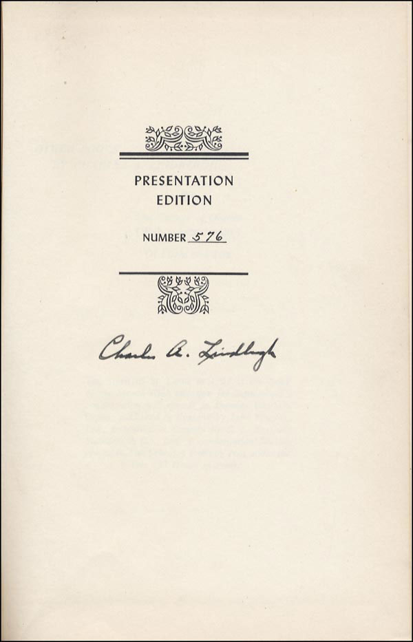 Signed book: The Spirit of Saint Louis - Presentation Edition. NY: Charles Scribner's Sons, 1953. Limited edition (number 576) hardcover with slipcase, 6 x 8.5, 562 pages. Signed 'Charles A. Lindbergh' on the Presentation Edition page, beneath the number 576. In fine condition. COA John Reznikoff/PSA/DNA and RRAuction COA.