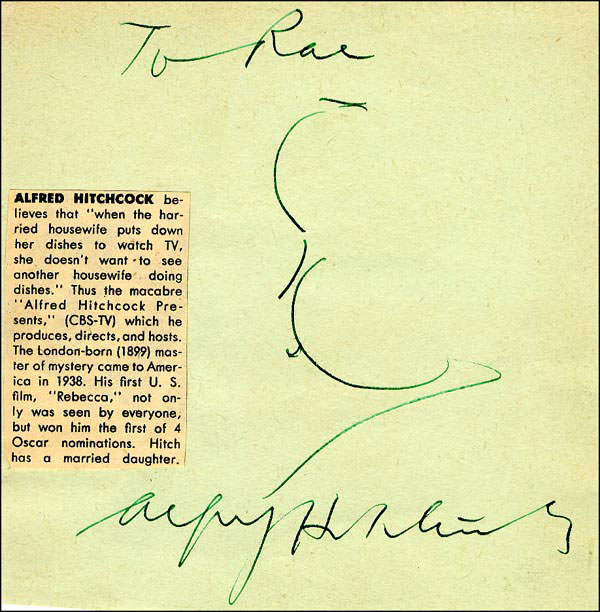 Terrific signed and inscribed fountain pen self-portrait of 'To Rae, Alfred Hitchcock' on a pale green 4.25 x 4.5 album page. In fine condition, with a small newspaper article, 1.25 x 2, affixed at left and a small photo of Hitchcock affixed to the reverse, light edge toning. RRAuction COA.