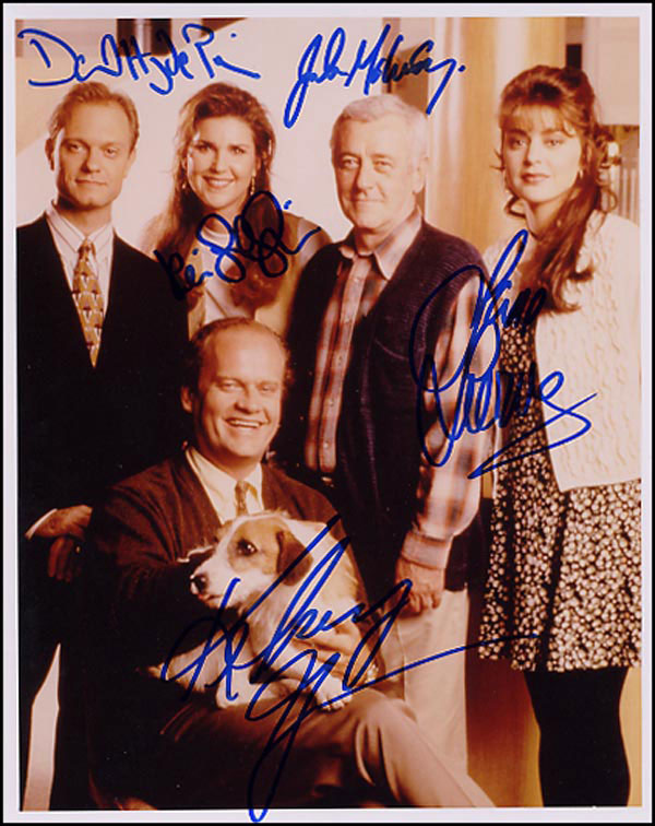 Terrific color glossy 8 x 10 cast photo from the Emmy award winning sitcom, signed by Kelsey Grammer, David Hyde Pierce, Jon Mahoney, Peri Gilpin and Jane Leeves in blue felt tip. The only member who hasn't signed is Moose (aka Eddie). In fine condition. RRAuction COA.