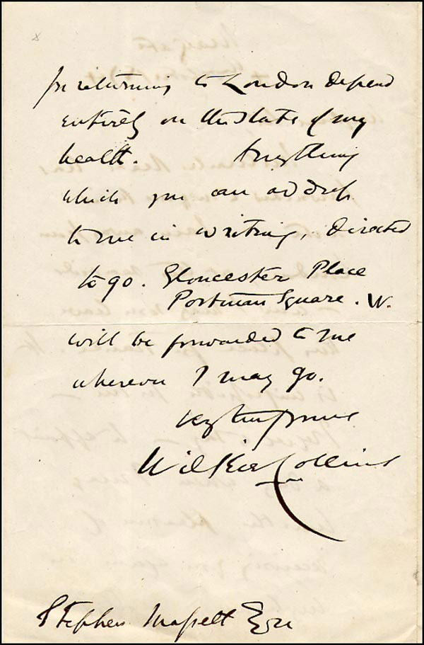 British author regarded as first British detective story writer. ALS, one page both sides, 5.75 x 8.75, October 4, 1874. In part: 'I am away from London, at the seaside, and I will soon leave this place for France. I may have the pleasure of receiving you again my house. Gloucester Place, Portman Square will be forwarded to me wherever I may go.' In fine condition, with vertical fold through one letter of signature, small separation at top border. RRAuction COA.