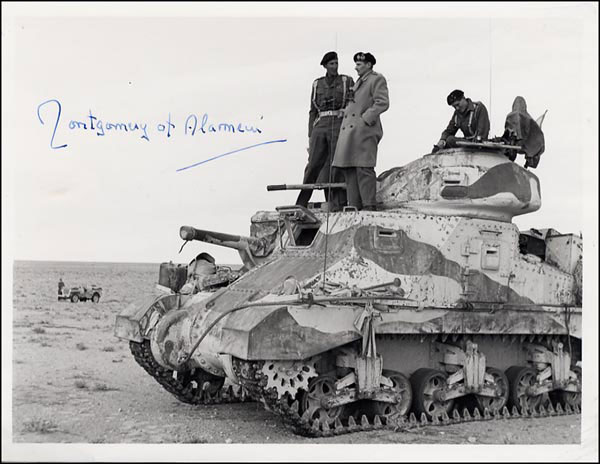 Commander who defeated Rommel in Africa. Vintage glossy 8 x 6 photo of Montgomery surveying the African desert from atop a tank, signed in fountain pen, 'Montgomery of Alamein.' In fine condition, with some scattered light surface marks and impressions. COA John Reznikoff/PSA/DNA and RRAuction COA.