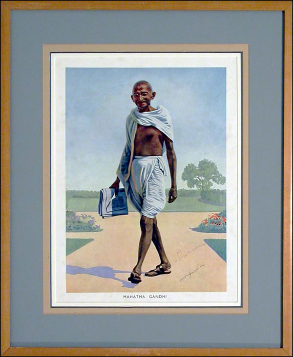 One of the 20th century's most important and influential leaders, he was assassinated by a Hindu fanatic in 1948. Unusual 11 x 15 full -length color paper print of a painting of Gandhi in traditional Indian dress and holding a newspaper, signed and inscribed in fountain pen 'For Gregg M. Sinclair, M K Gandhi.' The print is quadruple-matted and framed to an overall size of 18 x 22. In fine condition, with scattered light creasing, affecting neither the overall image or the signature. COA John Reznikoff/PSA/DNA and RRAuction COA.