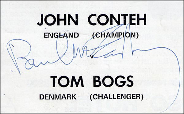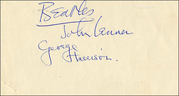 Outstanding group of ballpoint signatures on three separate pieces. Vintage 'Beatles John Lennon' and 'George Harrison' signatures on a 6.25 x 3.5 white card; vintage 'Paul McCartney' signature on a 3.5 x 2.25 slip cut from a magazine or program with the printed 'John Conteh England (Champion)' (world light-heavyweight boxing champion 1974-77) printed above his signature and 'Tom Bogs Denmark (Challenger)' printed below; and, 'To Martine, Best Wishes, Ringo Starr' with Ringo adding a sketched star beneath his signature on a 3.5 x 4 card bearing a photo of what appears to be a knee. All are in fine condition, with a set of staple holes to the lower left. Very clean examples. Perfect for matting. COA Roger Epperson and RRAuction COA.