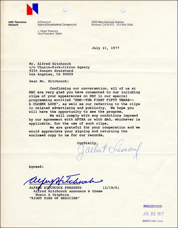 DS, one page, 8.5 x 11, NBC letterhead, July 21, 1977. Hitchcock gives his consent for NBC to air clips of his appearances on NBC in a special entitled "NBC- The First Fifty Years - A Closer Look." Hitchcock boldly signs on behalf of Alfred Hitchcock Presents. In fine condition, with a stamp date to lower right corner and punch holes to top edge. RRAuction COA.