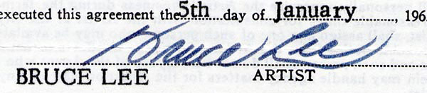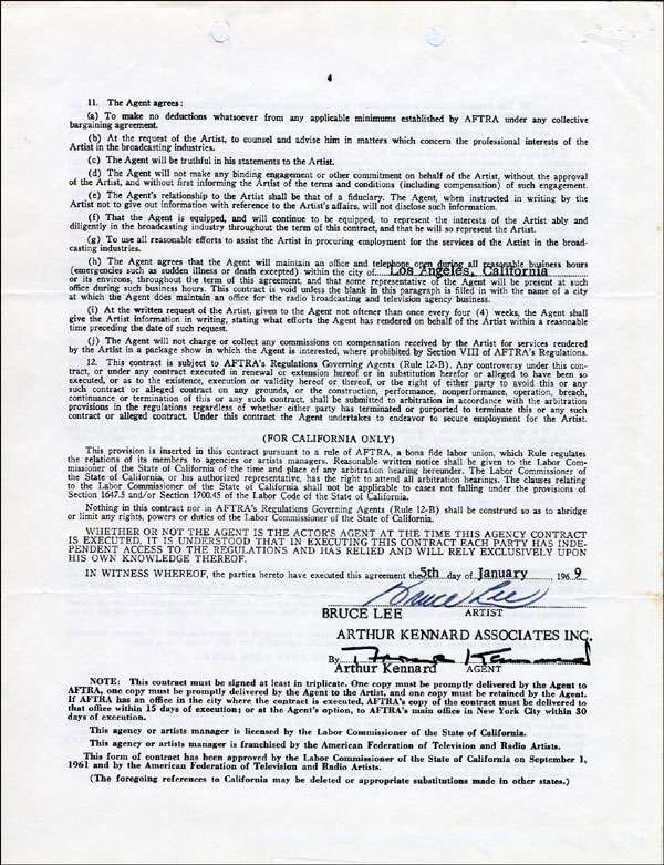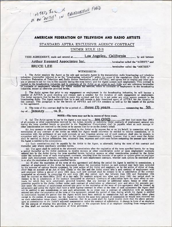 DS, two pages both sides, 8.5 x 11, AFTRA letterhead, January 5, 1969. Standard AFTRA exclusive agency contract between Lee and Arthur Kennard Associates, Inc. for a period of three years, with Kennard earning the standard ten percent. Nicely signed on the second page in black ink 'Bruce Lee.' A pencil notation to first page indicates 'Limited to work as an 'artist' in broadcasting field.' This contract was signed while Lee was appearing in the role of Kato on The Green Hornet. In fine condition, with expected punch and staple holes to both pages and a touch of light toning. RRAuction COA.