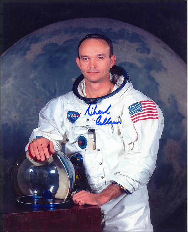 Color 8 x 10 photo of Collins in his space suit, signed in blue felt tip. Accompanied by a certificate of authenticity from NOVASPACE Galleries. In very fine condition. RRAuction COA.