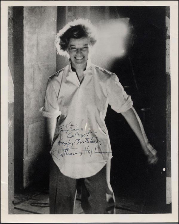 Vintage matte-finish 8 x 10 photo of the actress in a white shirt and dark slacks, signed and inscribed in fountain pen 'For Katherine Colbert - Happy Birthday - Katharine Hepburn.' In fine condition, with scattered creasing, small professionally repaired separation to left border, small nick to right border, bit of wear to top edge. RRAuction COA.