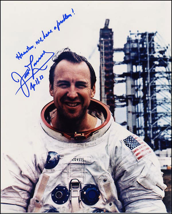 Color glossy 8 x 10 photo of Lovell in his space suit, signed 'Houston, we have a problem! Jim Lovell, Ap. 11.13' in blue felt tip. In fine condition. RRAuction COA.