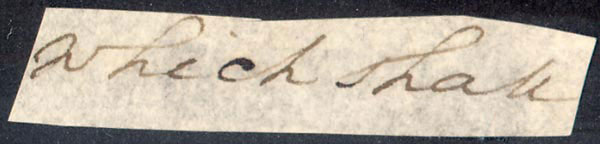 Two words penned in Washington's hand, 'which shall' on a trimmed 1.75 x .5 slip. Tastefully double suede matted with a plaque, a same-size copy of the original unsigned handwritten fragment with more than 125 words in Washington's hand and a color portrait of the president to an overall size of 20 x 16. In fine condition. RRAuction COA.