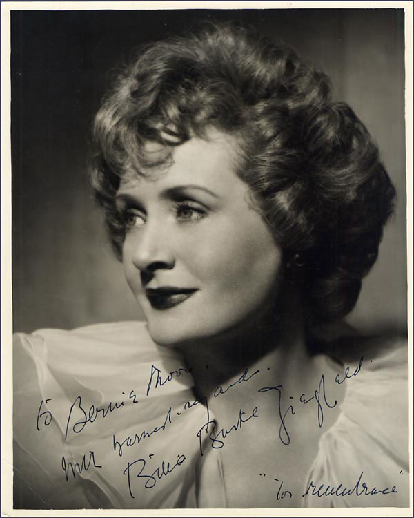 Splendid vintage pearl finish 8 x 10 three-quarter profile portrait, signed and inscribed in fountain pen 'To Bernie Moon with warmest regards, Billie Burke Ziegfeld.' In the lower right corner she has added, 'In remembrance.' In fine condition, with creases to the lower left and right corners and a few light surface impressions affecting nothing. RRAuction COA.