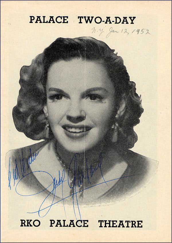 RKO Palace Theatre program cover, 6.5 x 9, featuring a nice image of Garland, signed in blue ink, 'Best wishes, Judy Garland.' A light bisecting vertical fold, otherwise fine condition. RRAuction COA.