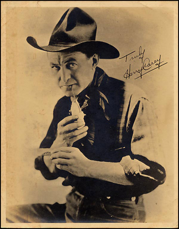 Vintage sepia matte-finish 7.5 x 9.5 photo of Carey rolling a cigarette, signed in fountain pen. Scattered light soiling and toning, otherwise fine condition. RRAuction COA.