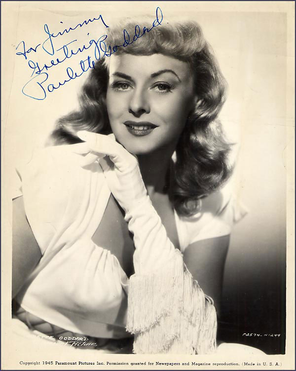 Vintage glossy 8 x 10 Paramount publicity photo, signed and inscribed in fountain pen 'For Jimmy, Greetings, Paulette Goddard.' In very good condition, with several noticeable creases and dings. RRAuction COA.
