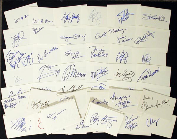 Tremendous lot of 250 ink and felt tip celebrity signatures, each on a separate 6 x 4 white card, and each obtained in person. Signers are: Lily Tomlin, John Glover, Bonnie Hunt, June Haver, Gary Shandling, Drew Carey, Wayne Brady, David Hasslehoff, Fred Willard, Rain Pryor, Mario Van Peebles, Christopher McDonald, Christina Applegate, Breckin Meyer, Jim Sheridan, Peter Saarsgard, Maggie Gyllenhaal, Isaac Mizrahi, Dave Koz, Ed Begley, Jr., Francis Ford Coppola, Jon Favreau, Jennifer Tilly, Donald Trump, Lance Bass, Lisa Rinna, Daisy Fuentes, Stephen Dorff, Josh Charles, Skelley Morrison, John Waters, Annette O'Toole, Michael McKeon, Carson Kressley, Matt Stone, Alyssa Milano, Russell Simmons, Norman Lear, Marcia Wallace, Mark Ruffalo, Marla Maples, Elizabeth Forsythe Hailey, Marilu Henner, Greg Evigan, Isabella Miko, Richard Anderson, Robert Hayes, Eric McCormick, Stan Lee, Hugh Heffner, Daryl Satora, Stella Stevens, Sam Harris, Michael Richards, Dr. Phil McGraw, Robert Osborne, Donna Pescow, Eva Marie Saint, Joey Fatone, Tom Arnold, Tia Carrera, Ron Silver, Mr. T., Bill Maher, Joshua Jackson, Jeff Corwin, Richard Crenna, Carson Daly, Joey McIntyre, Jacob Vargas, Sasha Pietese, Jamie Strange, Rebecca Creskoff, Emily Vancamp, Peter Bogdonovich, William H. Macy, Jason Hervey, Dana Delany, Rene Russo, Simon Baker, Ken Krageu, Marianne Jean Baptiste, Poppy Montgomery, Joey Lauren dams, Howard Hessman, Jane Fonda, Carole Cook, Carol Channing, Bonnie Franklin, Jeffrey Tambor, Florence Henderson, Stefanie Powers, Nancy Dussault, Heather Thomas, Albert Brooks, Valerie Perrine, Brad Garrett, Carol Burnett, Teresa Ganzel, Richard Benjamin, Marlee Matlin, Catherine Bach, Camryn Manheim, Victoria Rowell, Robert Goulet, Richard Schitt, Mr. Blackwell, Johnnie Cochran, Arianna Huffington, Barbara Sinatra, Angie Dickinson, Nancy Olson, Tom Verica, Janel Maloney, Noah Hathaway, Victor Garbe, Christian Slater, Sally Field, Gena Rowlands, Valerie Harper, Marilyn and Alan Bergman, Larry Moss, William Smith, Barbara Luna, David Faustino, Dale Robertson, Sue Anne Langdon, Larry Manetti, Katharine Ross, Sam Elliott, Lloyd Schwartz, Kent McCord, Jack Larson, Art Linkletter, Lynette Spang McCook, The Smothers Brothers, Bonnie Hunt, Norm Crosby, Eddie Griffin, Mitzi Gaynor, Pauly Shore, Tim Stack, Robert Costanzo, Dennis Farina, Lynne Stewart, Pat Harrington, Joe Montegna, Kevin Nealon, Mindy Sterling, Jerry Bruckheimer, Edward Furlong, Ted McGinley, Matthew Perry, Danielle Fischel, James Avery, Dennis Hopper, Sally Kellerman, Michelle Phillips, Jacqueline Bisset, Joanne Worley, Monty Hall, Reba McEntire, Ken Howard, Doris Roberts, Charles Nelson Riley, Rhonda Fleming, Phyllis Diller, Joan Van Ark, Burt Bacharach, Sharon Gless, Christine Lahti, Amy Brenneman, Michelle Klunie, Hal Sparks, Peter Paige, Scott Lowell, LL Cool J, Sasha Alexander, Shirl Bernheim, Jason O'Mara, Caitlyn Wachs, Juliane Nicholson, Felicity Huffman, Ruta Lee, Tom Dreesen, Louis Gossett, Jr., Margaret O'Brien, Michael Moore, Nikki Sixx, Don Cheadle, Kimberly Williams, Brad Paisley, Nia Vardalos, Steven Weber, Red Buttons, Davis Gaines, Terry Moore, Roger Moore, Mira Sorvino, Loni Anderson, Lacey Chabert, Candy Clark, Dina Merrill, Sam Harris, Harry Hamlin, David Rasche, Lance Henrickson, Ed Harris, Ruth Buzzi, Victoria Pratt, Nick Stahl, Debbie Allen, Leonard Nimoy, Kato Kaelin, Dedee Pfieffer, George Barris, Richard Hatch, Kathryn Crosby, Lee Meriwether, Anne Jeffries, Hugh O'Brien, Carol Conners, Karen Sharpe Kramer, Ronald Isley, Patricia Morison, Jack Lalanne, John Eddie, Sharon Lawrence, E. G. Daily, Donna Douglas, Tyne Daly, Telma Hopkins, Dennis Weaver, Pamela Bellwood, Debby Boone, John Rhys Davies, Angela Lansbury, Joannie Lauer, Bo Svenson, Richard Thomas, Betty White, Marsha Thompson, Jonathan Lipinski, Holly Robinson, George Lopez, Wallace Shawn, Neal McDonough, Barry Levinson, John Edward, Gallagher, Donna Mills, Leigh Taylor Young, Kathy Baker, Pamela Reed, Michael Cole, Sally Kellerman, Deborah Gibson, Johnny Galecki, Cyndi Garvey, James Darren, Alex Rocco, Hugh Grant, Barbara Feldon, David Steinberg, Bonnie Franklin, Helen Mirren, Ann Rutherford, Rita Lee, Chita Rivera, Pat Boone, Bea Arthur, Rhonda Fleming, Paula Lane, James Avery, Karen Morrow, Cyd Charisse, Jayne Meadows, Rob Marshall, Rip Taylor, Tony Martin, Orlando Jones, Tippi Hedren, Harry Dean Stanton, Julianne Moore, Edy Williams, Charles Durning, Norm Crosby, Esther Williams and Joseph Bologna. There are some duplicates to the aforementioned names, and some signers have also added inscriptions or sentiments. In fine condition. RRAuction COA.