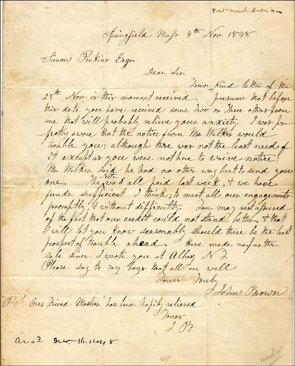 A fanatical abolitionist, Brown maintained an Underground Railroad station in Ohio. In the mid-1850s, he moved to Kansas, where he led a guerrilla band responsible for the Pottawatomie massacre. Supported by six wealthy patrons, he planned to capture the Federal arsenal at Harper's Ferry and distribute the weapons to slaves. The violent plot ultimately failed when he was captured by Robert E. Lee and hanged, but his insurrection led the country closer to the Civil War. ALS, one page, 8 x 10, Springfield, Mass., November 4, 1848. A letter to his business partner, Simon Perkins, in Akron Ohio. In part: 'Your kind letter of the 25th Nov is this moment received. Presume that before this date you have received some two or three letters from me that will probably relieve your anxiety. I was perfectly aware that the notice from Mr. Walker would trouble you; although there was not the least need of it except as you were not here to waive notice. Mr. Walker said he had not other way but to send you one. The note was all paid last week, and we have funds sufficient I think to meet all our engagements promptly and without difficulty. You may rest assured of the fact that our credit could not stand better and that I will let you know should there be the least prospect of trouble ahead. Have made no further sale since I wrote you at Albany NY. Please say to my boys that all are well...John Brown.' He adds the postscript, 'P.S. Our friend Mosher [?] has be happily relieved. Yours, JB.' Accompanied by an unsigned image of Brown. In fine condition, with sealing wax remains and a small area of paper loss to the integral address panel, scattered soiling and several mailing folds, none of which affect the legibility of the letter or the signature. COA John Reznikoff/PSA/DNA and RRAuction COA.