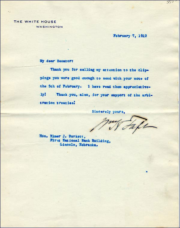TLS as president signed 'Wm. H. Taft,' one page, 7 x 8.75, The White House, Washington letterhead, February 7, 1912. A letter to Elmer J. Burkett. In full: 'My dear Senator: Thank you for calling my attention to the clippings you were good enough to send with your note of the 5th of February. I have read them appreciatively! Thank you, also, for your support of the arbitration treaties! Sincerely yours, Wm. H. Taft.' In fine condition, with some light brown haloing to the signature and minor rippling with trivial soiling to the right margin. RRAuction COA.