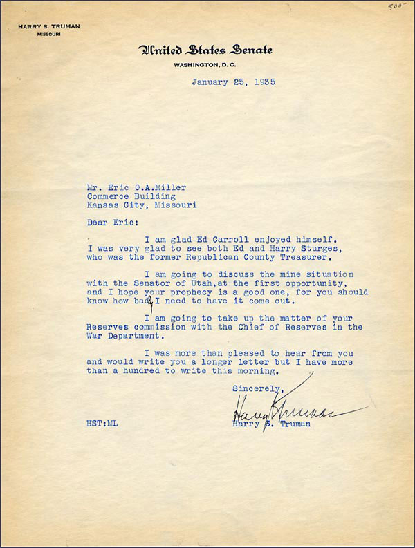 TLS, one page, 8 x 10.25, United States Senate, Washington, D.C. letterhead, January 25, 1935. In part: 'I was very glad to see both Ed and Harry Sturges, who was the former Republican County Treasurer. I am going to discuss the mine situation with the Senator of Utah, at the first opportunity, and I hope your prophecy is a good one, for you should know how badly I need to have it come out. I am going to take up the matter of your Reserves commission with the Chief of Reserves in the War Department.' In fine condition, with edge toning, a paper clip impression and two staple holes to the upper left. The 'ly' in 'badly' has been entered by hand. RRAuction COA.