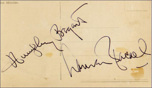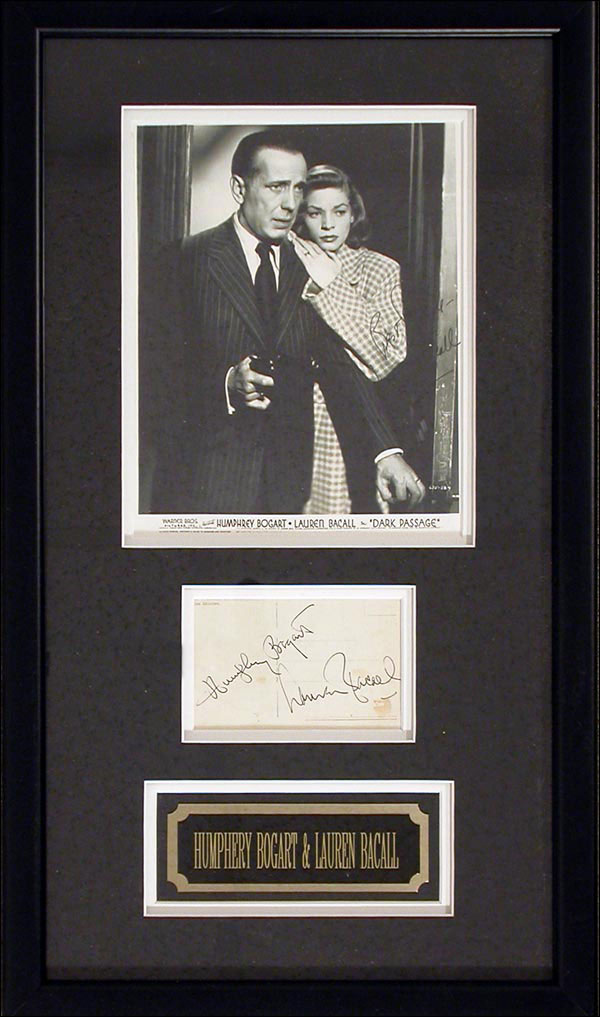 Fountain pen signatures, 'Humphrey Bogart' and 'Lauren Bacall,' on the correspondence side of an off-white postcard. Double matted and framed with a promotional photo of the two from Dark Passage, to an overall size of 13.5 x 23.5. A bit of light soiling, one spot approaching Bacall's signature, otherwise fine condition. RRAuction COA.