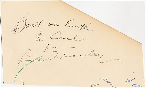 Fountain pen signature and inscription, 'Best on Earth to Carl from Bill Frawley,' on an off-white irregularly trimmed album page, about 8 x 5. In fine condition, with a single ink stroke through first name of signature from a removed signature. Accompanied by a Certificate of Authenticity from PSA/DNA and RRAuction COA.