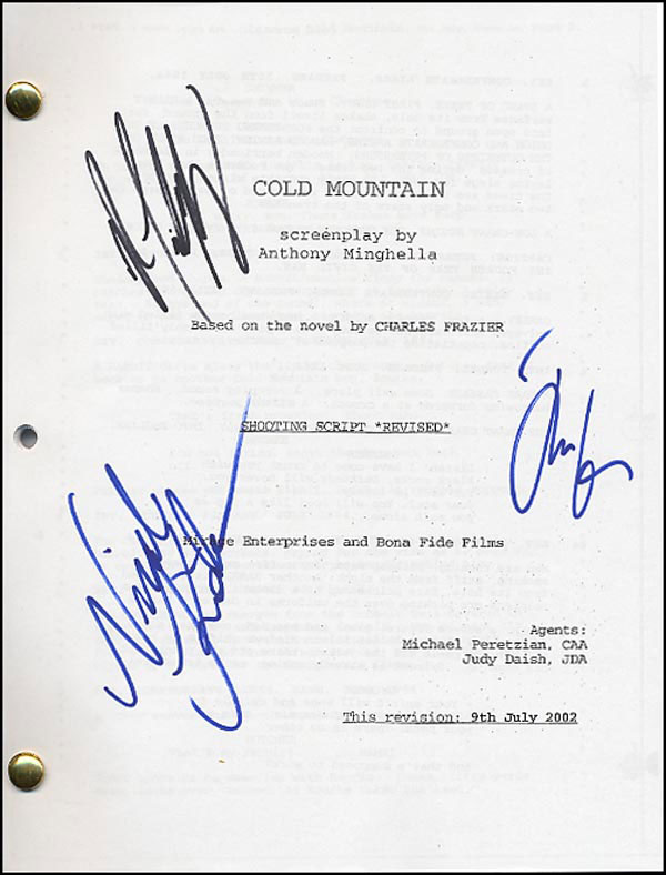 Copy of the revised shooting script for Cold Mountain, dated July 9, 2002, 118 pages. Signed on the front cover in blue felt tip by Nicole Kidman and Jude Law and in black felt tip by Renee Zelwegger. In fine condition. RRAuction COA.