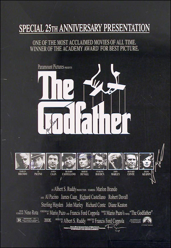 Poster for the 25th anniversary of The Godfather, 27 x 39, signed in-person in blue and black felt tip by Al Pacino, James Caan, Robert Duvall, Diane Keaton and Francis Ford Coppola. In fine condition. Rolled. RRAuction COA.