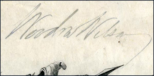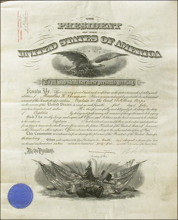 DS as president, one page, 15.5 x 19.5, August 10, 1916. President Wilson promotes Marcellus H. Thompson to the rank of Captain in the Coast Artillery Corps, signed at the bottom in black ink by Wilson and counter-signed by his Secretary of War. A light horizontal document fold through signature and some scattered light toning and wrinkling, otherwise fine condition. RRAuction COA.