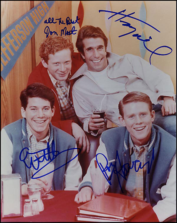 Color glossy 8 x 10 cast photo, signed in blue felt tip by Ron Howard, Anson Williams, Don Most (adding 'All the best') and Henry Winkler. In fine condition. RRAuction COA.