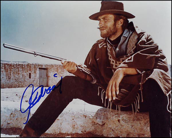 Color glossy 10 x 8 photo of Clint wearing a hat, poncho, firearm and a stogie in his mouth in a scene from For A Few Dollars More, signed in blue felt tip. In fine condition. RRAuction COA.