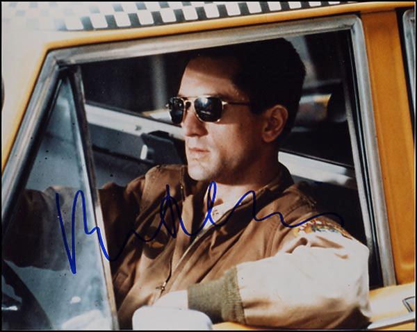 Color glossy 10 x 8 photo of DeNiro as Travis Bickle behind the wheel of his hack in a scene from the great film Taxi Driver, signed in blue felt tip. In fine condition. RRAuction COA.