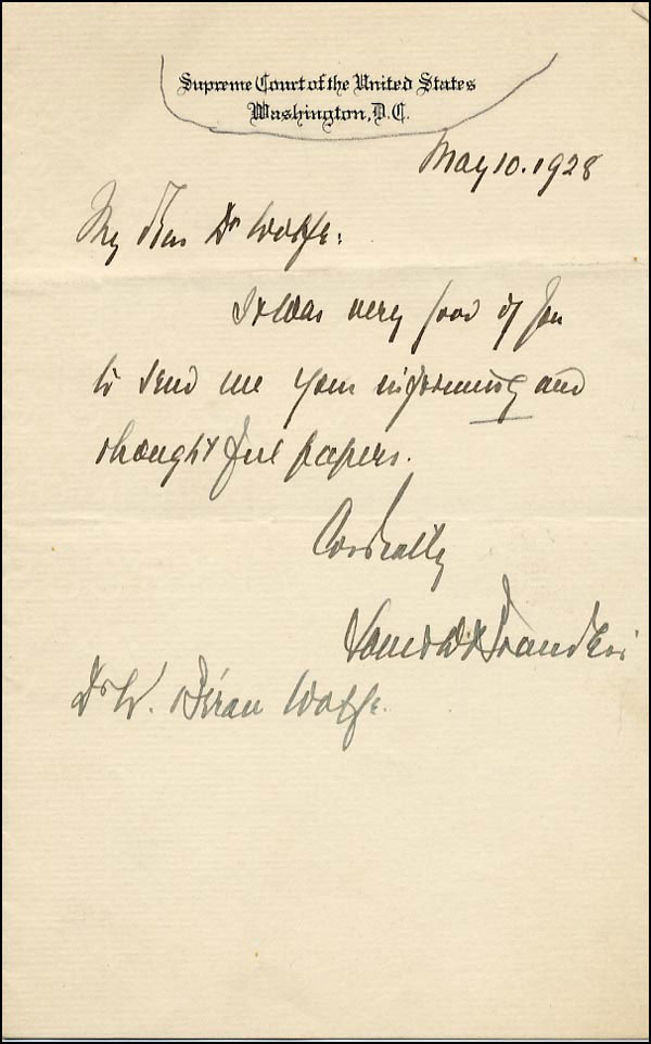 Associate justice of the US Supreme Court, 1916 - 39; known as 'The People's Attorney,' Brandeis was renowned for his devotion to free speech. ALS, one page, 4.75 x 7.75, Supreme Court of the United States, Washington, D.C. letterhead, May 10, 1928. In part: 'It was very good of you to send me your enlightening new thoughtful papers.' In fine condition, with Printed Supreme Court heading partially encircled. RRAuction COA.