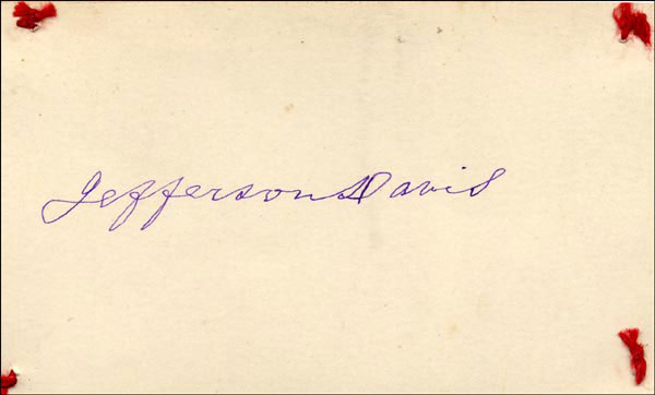 Fountain pen signature, 'Jefferson Davis,' on an off-white 3.75 x 2.25 card. Card is affixed by each corner with red string to a slightly larger sheet. In fine condition. RRAuction COA.