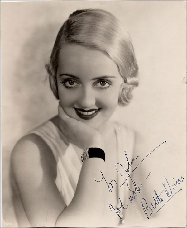 Vintage glossy 7.5 x 9.25 photo of the lovely young Davis, signed and inscribed in fountain pen 'For John - Good wishes - Bette Davis.' In fine condition, with some scattered light surface marks and impressions, small repair to right edge and a couple of dings. RRAuction COA.