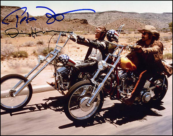 Color glossy 10 x 8 photo of the pair on the road on their biked, signed in black felt tip by Dennis Hopper and in blue felt tip by Peter Fonda. In fine condition. RRAuction COA.