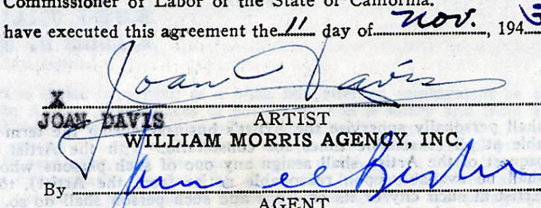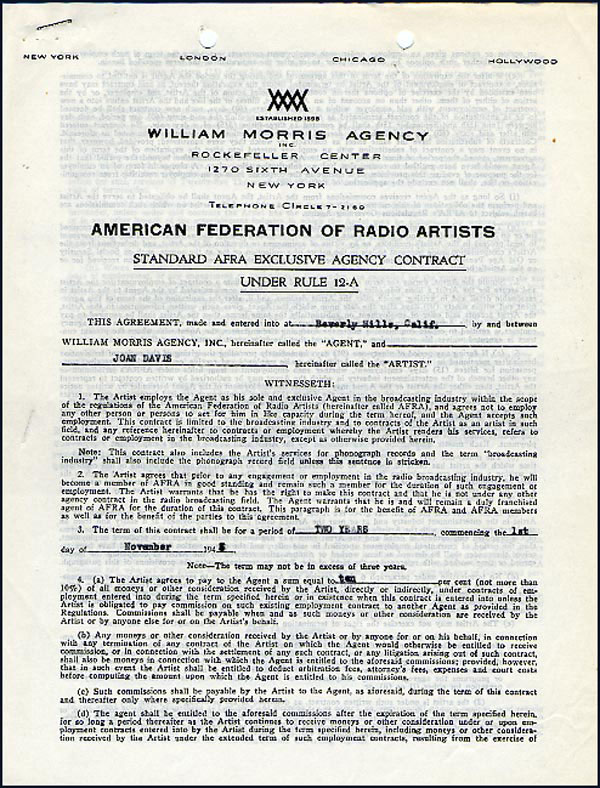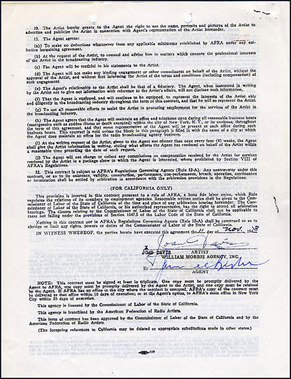 DS, two pages both sides, 8.5 x 11, William Morris Agency letterhead, November 11, 1943. Standard AFRA exclusive agency two year contract between Davis and the William Morris Agency for the standard ten percent commission. Signed on the reverse of the second page in black ink by Davis. In fine condition, with staples to left side, punch holes to top and a light shade of toning. RRAuction COA.