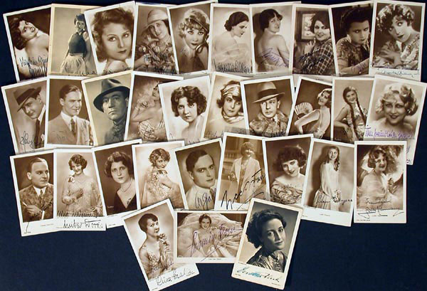 Lot of thrity two vintage 3.5 x 5.5 German postcard photos, all signed in ink or fountain pen by the respective actor or actress pictured, with a couple adding inscriptions or sentiments. Signers include: Lien Dyers, Lotte Neumann,Georg Alexander, Lillian Harvey and Dolly Hass. In very good overall condition. RRAuction COA.