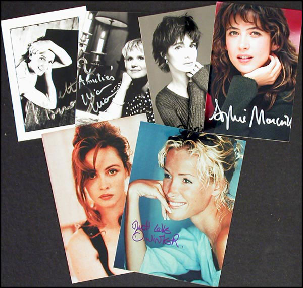 Lot of six signed photos, ranging in size from 4 x 5.5 up to 5 x 7, including three color, each signed in ink or felt tip by the respective actress pictured. Signers are: Juliette Binoche, Miou-Miou, An Parillaud, Sophie Marceau, Ophelie Winter and Emmanuelle Beart. In fine condition. RRAuction COA.