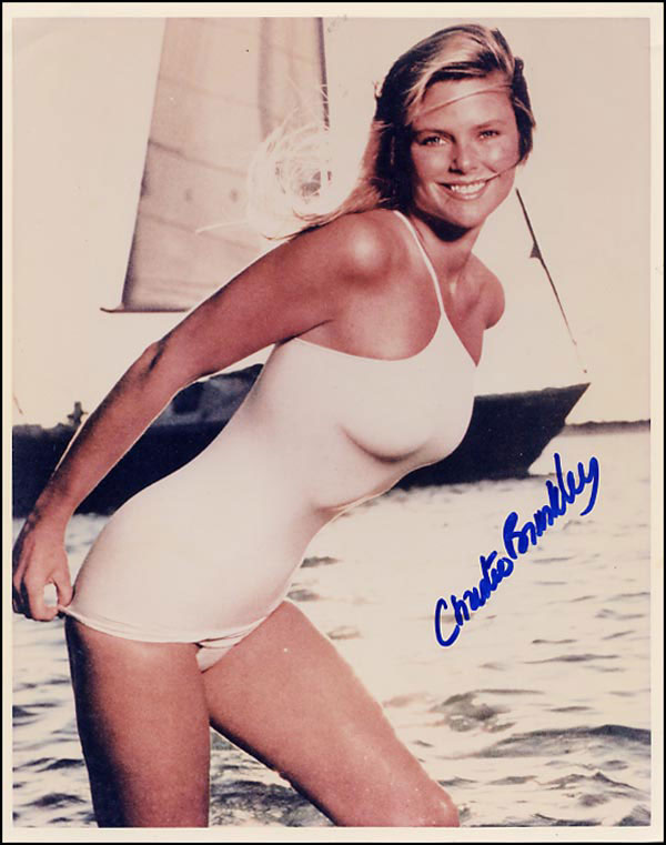 Super sexy color glossy 8 x 10 photo of Brinkley in a white bathing suit, signed in blue felt tip. Obtained in person by New York City collector Blake Levine. In fine condition. RRAuction COA.