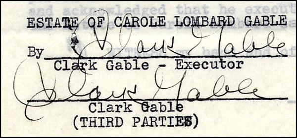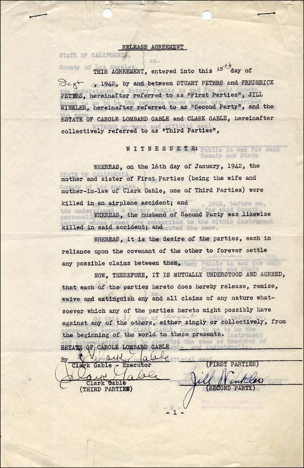 DS, two pages, 8.5 x 13, September 15, 1942. Notarized Release Agreement signed twice by Clark Gable, reads, in part, 'Whereas, on the 16th day of January, 1942, the mother and sister of First Parties (being the wife and mother-in-law of Clark Gable, one of Third Parties) were killed in an airplane accident; and whereas, the husband of Second Party was likewise killed in said accident; and whereas, it is the desire of the parties, each in reliance upon the covenant of the other to forever settle any claims between them, now therefore it is mutually understood and agreed, that each of the parties hereto does hereby release, remise, waive and extinguish any and all claims of any nature whatsoever which any of the parties hereto might possibly have against any of the others, either singly or collectively, from the beginning of the world to these presents. ESTATE OF CAROLE LOMBARD, by Clark Gable - Executor and Clark Gable, (Third Parties) and Jill Winkler (Second Party). In fine condition, with expected age and handling wear to edges, scattered light creasing, usual file and staple holes, a tiny hole affecting one letter of one of Gable's signatures. RRAuction COA.