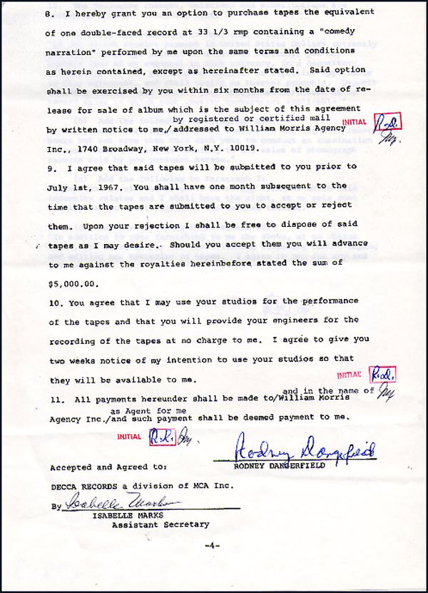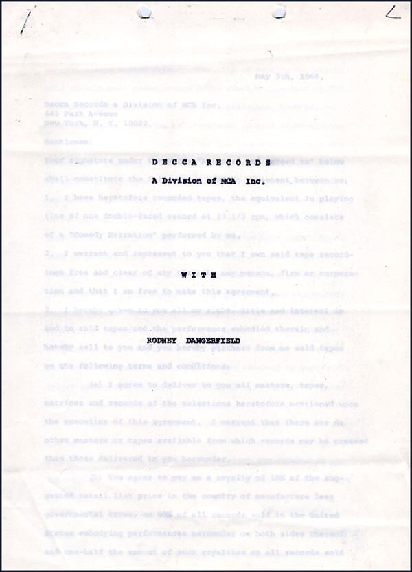 DS, five pages, 8.5 x 13, Decca Records letterhead, May 5, 1966. Agreement between Dangerfield and Decca Records regarding royalties, masters, tapes, etc. for a comedy album wherein he grants Decca all of his rights, title and interest. Dangerfield signs on page four and initials the agreement six times. In fine condition, with usual file and staple holes, scattered creasing. RRAuction COA.